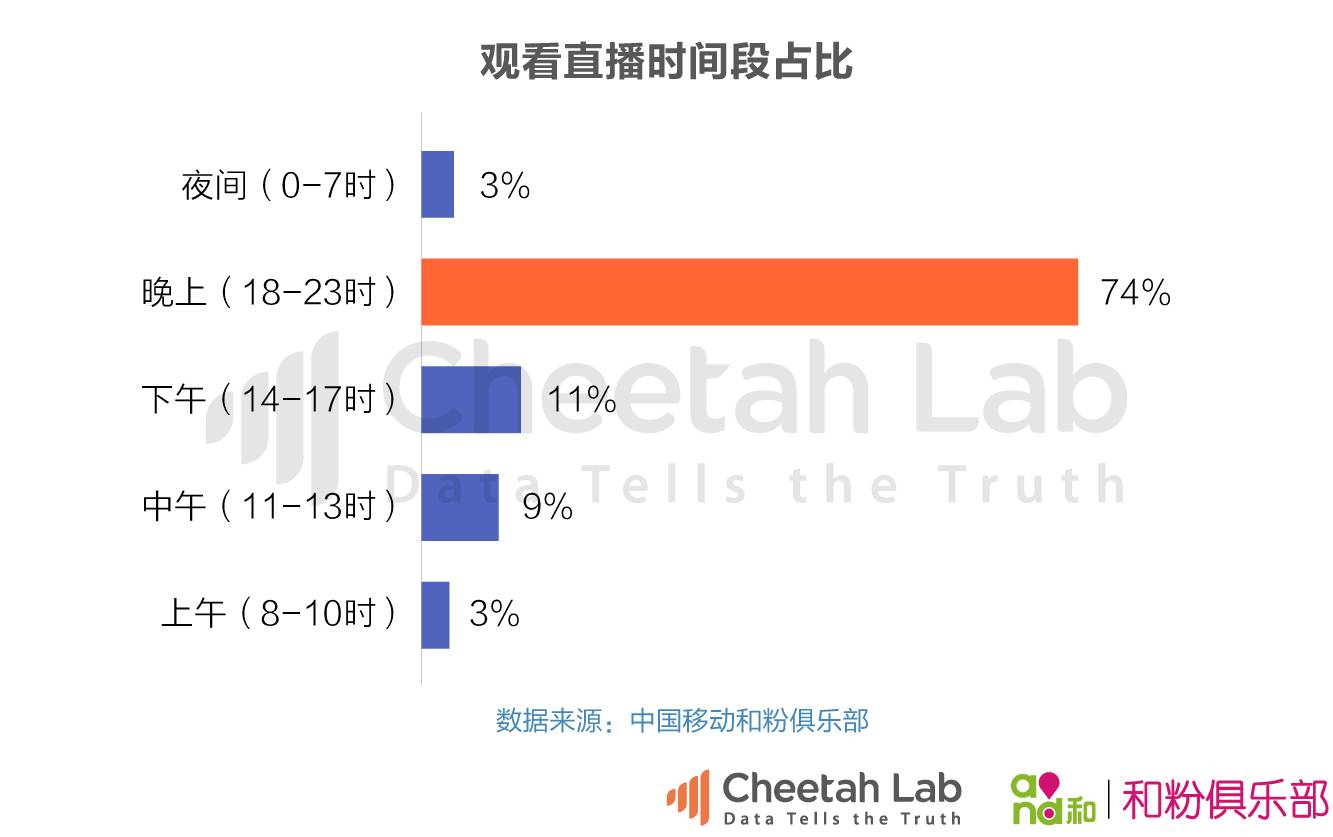 从观看直播时间段来看,74%的用户在晚上18:00-23:00看直播,说明用户们偏向在结束了一天的工作和学习之后,把看直播当做放松和休息,是健康的娱乐方式。