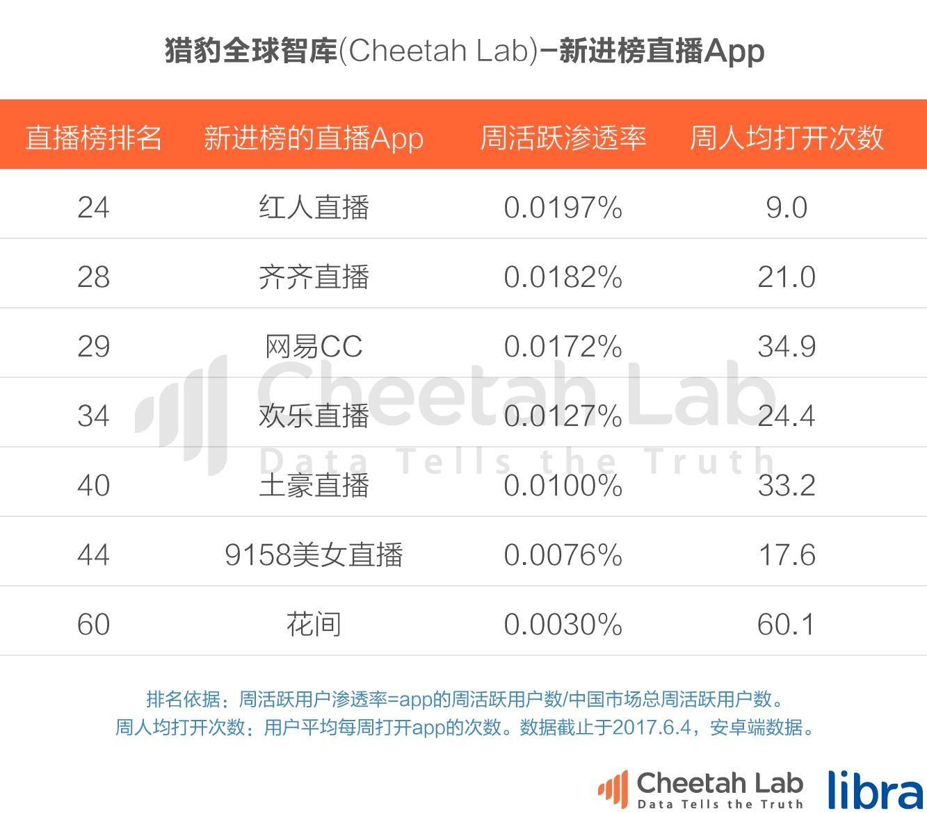 但有趣的是,对于泛娱乐直播app来说,挑战与机会总是同在:在新登上猎豹全球智库排行榜的直播app中,100%都是秀场app。