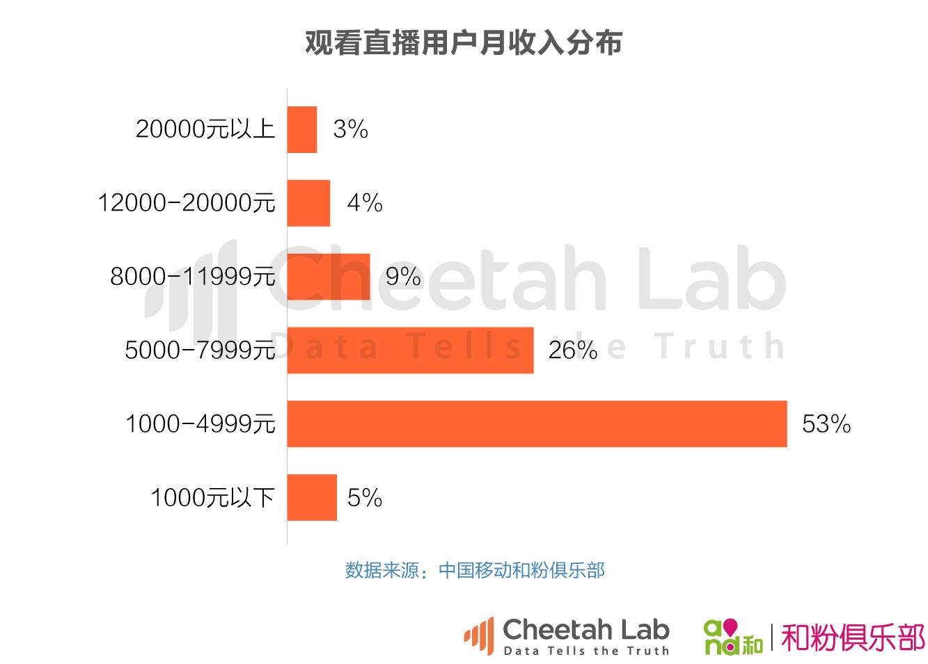 这与用户的收入有直接关系。调研结果显示,超过半数的直播用户月收入在1000-4999元之间。