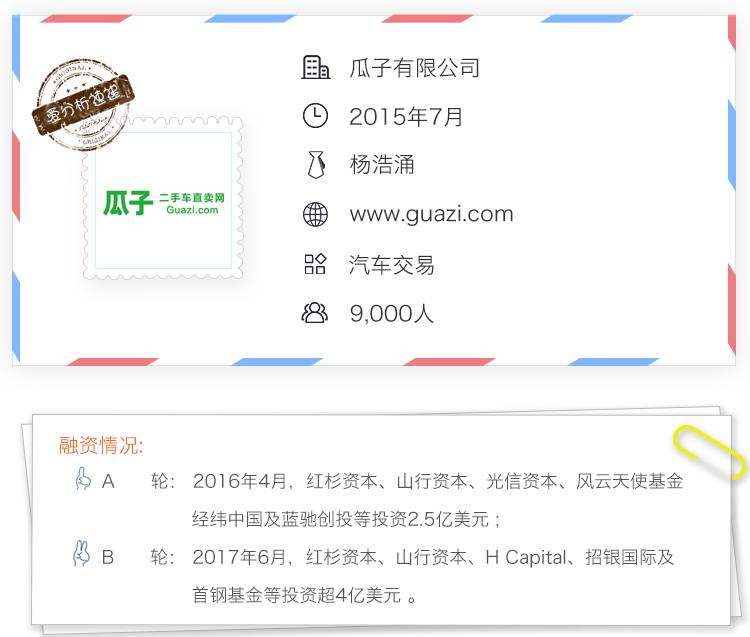 6月初,瓜子完成超4亿美元B轮融资,投后估值超过25亿美元,成为二手车交易领域排头兵。CEO杨浩涌旗下的山行资本也参与投资数千万美元。瓜子计划今年底,单月交易量超过Carmax,站上世界之巅。