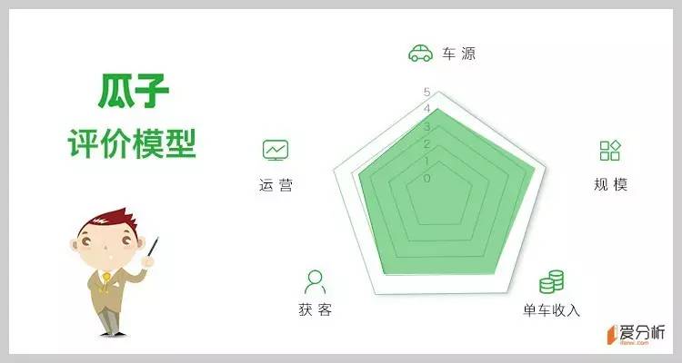 根据爱分析评价模型,二手车电商从车源、规模、单车收入、获客、运营等5个维度进行分析。