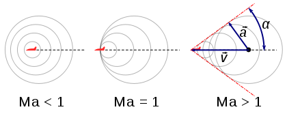 这里顺便说一下激波(Shock wave),简单的讲,激波就是物体在某种介质中运动,当速度足够快时,对这种介质产生的扰动来不及传播开来,被迫迭加形成的压缩波。通常飞机产生激波,或螺旋桨产生激波,大致都可以这样理解。
