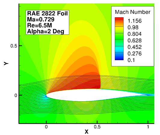 ▲这是超临界翼型RAE2822在0.729马赫(2度攻角)下模拟计算所得到的马赫数流场,在翼型最厚处,马赫数已经大于1(越红越数值越大)