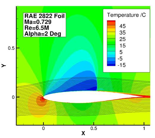 所以,在飞机或炮弹的表面上,气流最早达到超声速的地方并不是在头部,而是在横截面积最大的地方。通常把物体此时的马赫数称为“临界马赫数”,根据飞行物的形状不同,这个数字从0.6到0.9都有可能。那么气流达到了超声速,会发生什么情况呢?上面这幅图同样还是超临界翼型RAE2822在同等条件下的模拟计算结果,只是物理量换成了温度,也就是温度场。对比上图(注意流场颜色和图例),你有何发现?