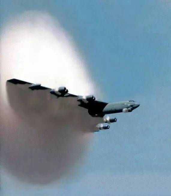 可以看出,“音爆云”产生时,飞机与静止空气之间的相对运动速度还尚未达到声速,但也不能说与突破声障毫无关系,因为“声障”的实质是激波带来的巨大阻力,而“音爆云”实际上是与局部激波相伴生的现象。当然,根据其产生的原理,某些亚声速飞机同样会在达到临界马赫数时产生“音爆云”,比如最快能飞到第小时1000公里,约相当于0.8马赫的B-52就有此本领。