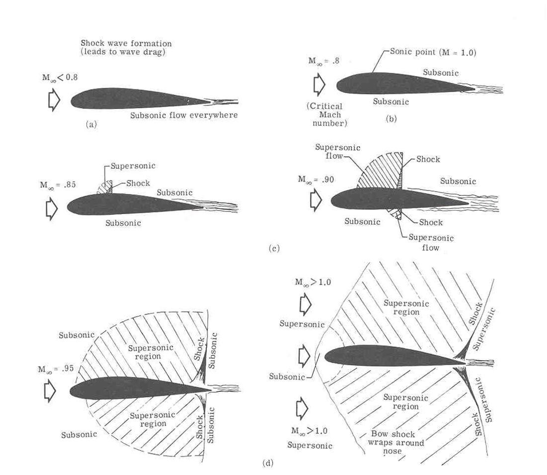 以上的分析是把飞机作为一个点来看待,这是一种简化的分析。一个点要产生激波,运动速度当然就得结结实实的达到声速才行。但飞机实际上是一个三维的立体物,细致分析的话,并不能完全简化为一个点。