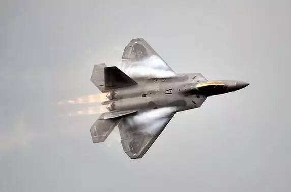 ▲这架F-22拉出四道涡流尾部喷出了漂亮的马赫环(Shock diamond)