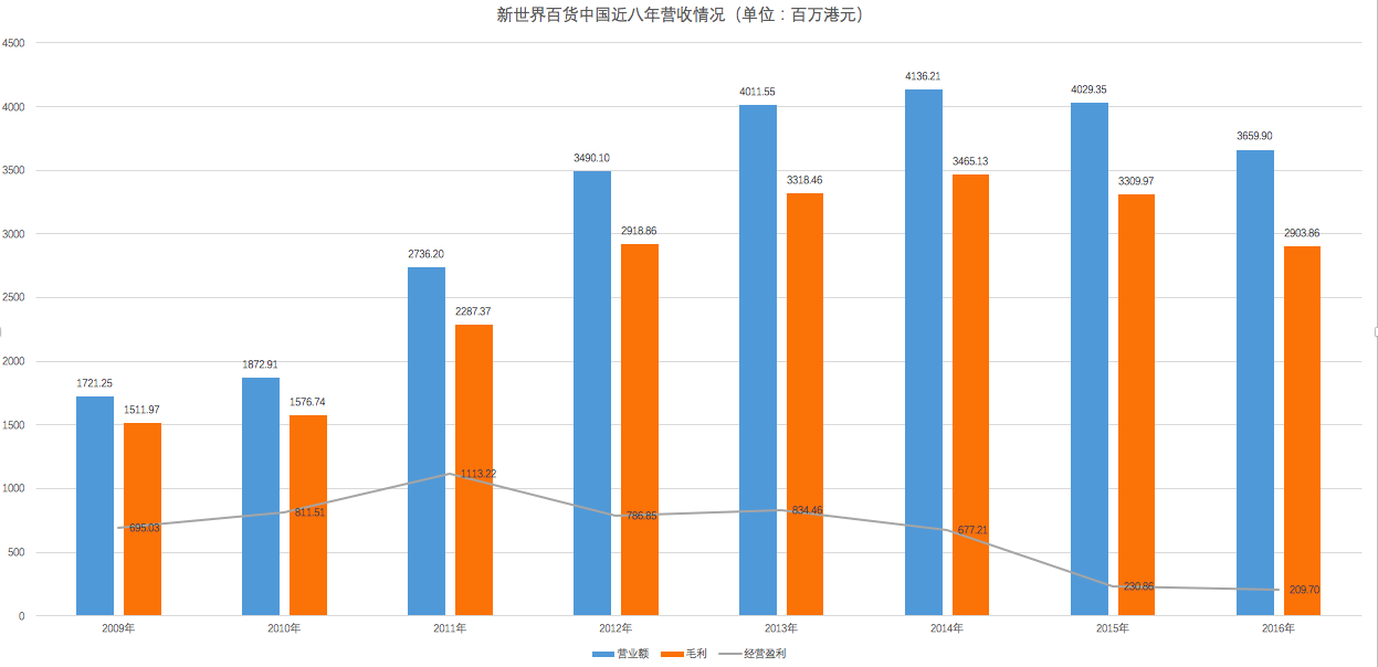 据新世界百货财报数据显示,2009年-2014年间,新世界百货营业额呈稳步上升趋势,但2014年后,新世界百货营业额连续两年下跌。2016财年(截至2016年6月30日),新世界百货收益较上年减少9.2%至36.60亿港元。而2016年A股市场49家百货商店业态公司营收同比仅下降0.01%,归母净利润同比增长7.78%。新世界百货的经营利润也从2011年的11.13亿港元后下跌至2016年的2.10亿港元。
