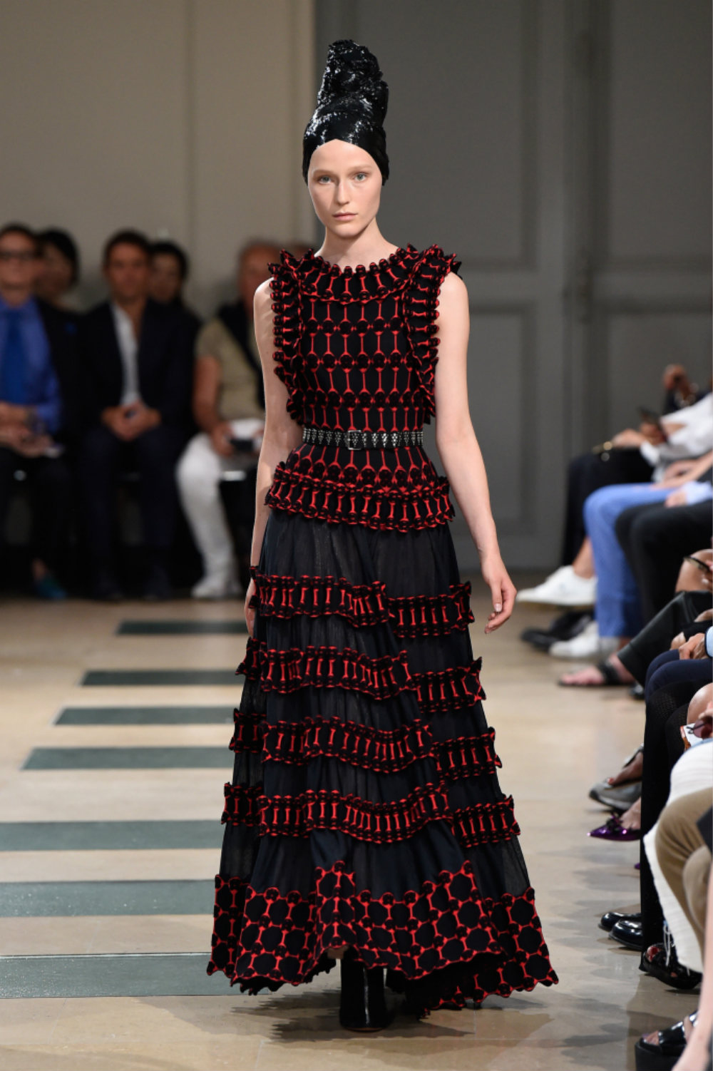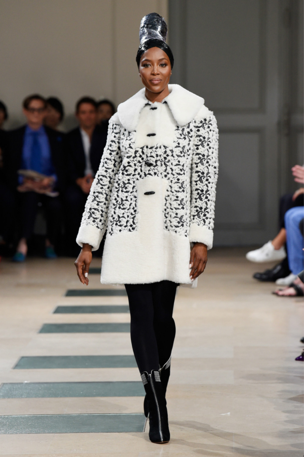 这是2011年过后,Azzedine Alaïa举办的首场高定发布会。设计师的灵感缪斯Naomi Campbell身着黑白刺绣的A字剪羊毛大衣开场,头发高高竖起绑在透明头巾里,好一副非洲女王的架势。