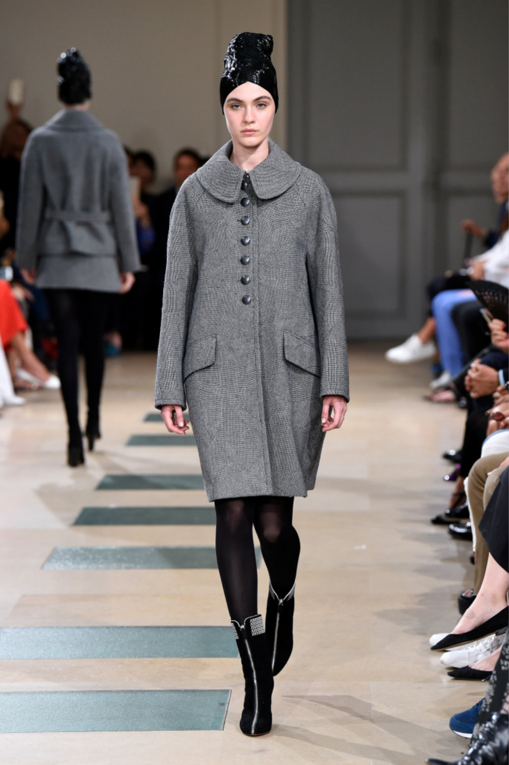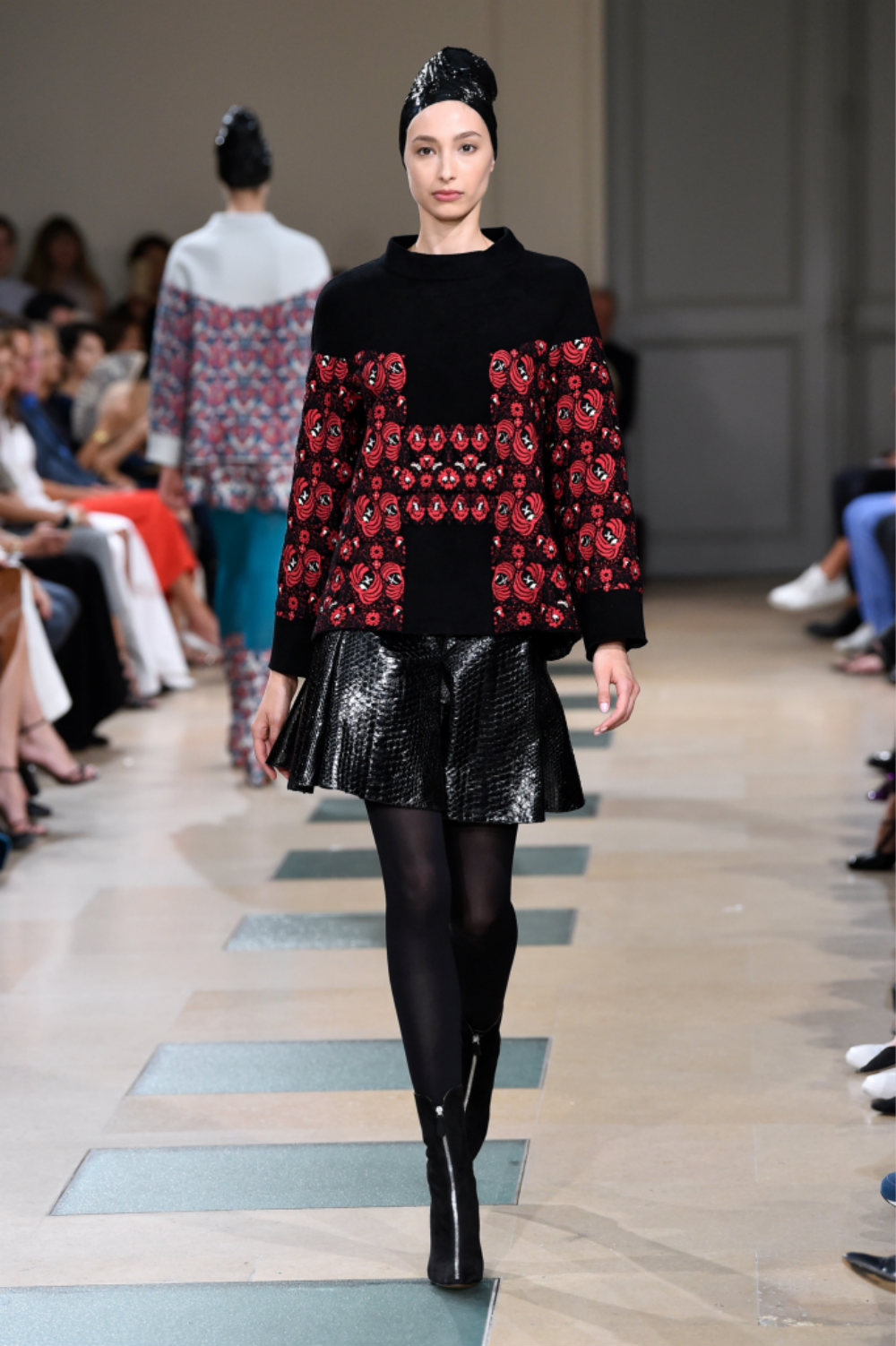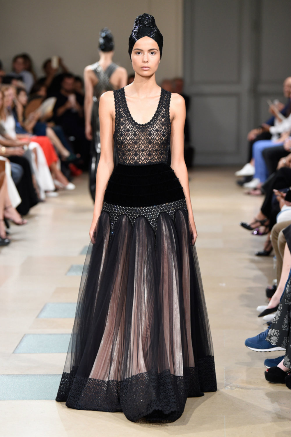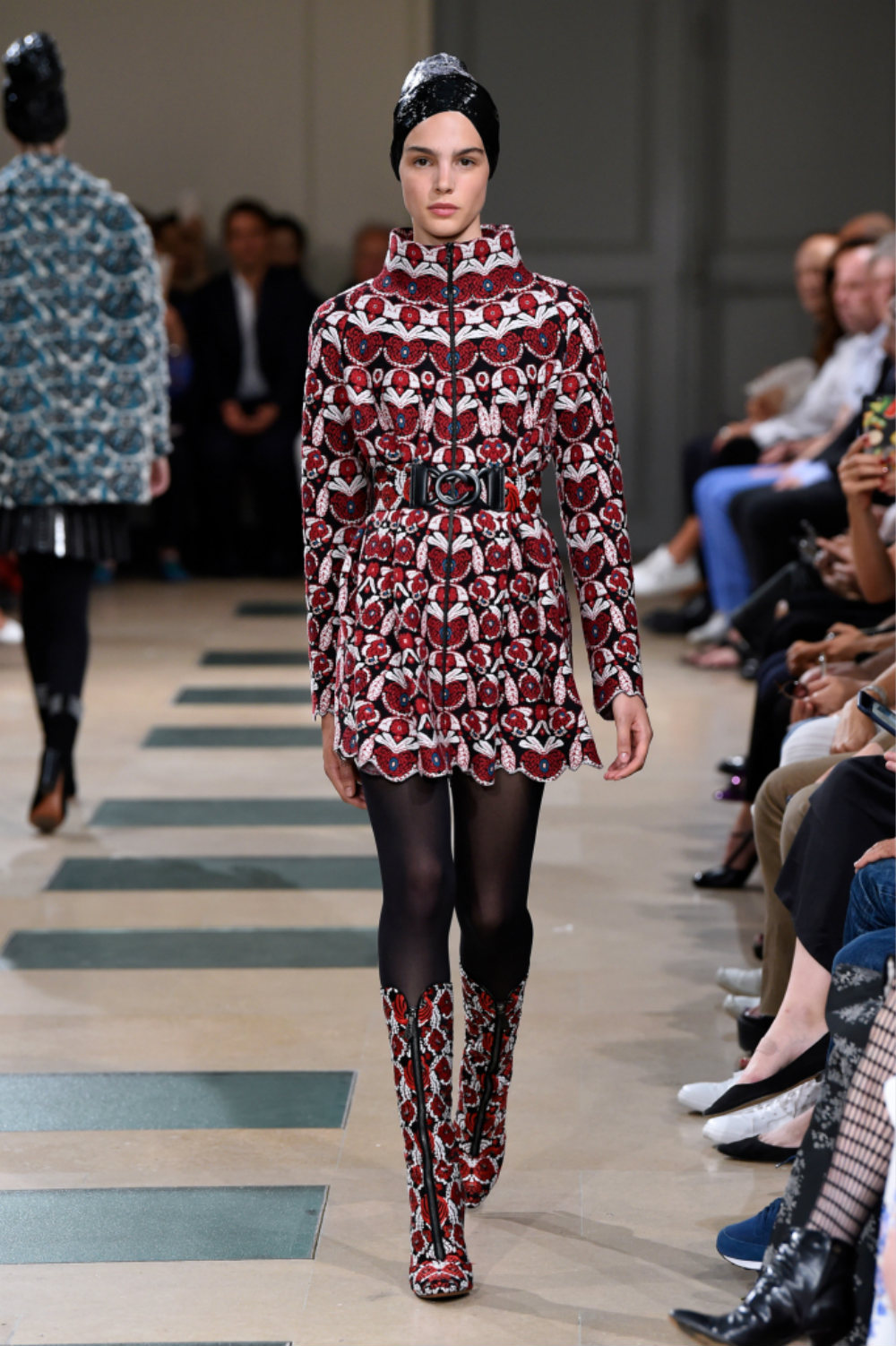 尽管2017秋冬高定系列的前半段以刺绣直筒外套为主,甚至穿插着几款1960年代的优雅茧型大衣,Azzedine Alaïa还是不忘给整体造型配上褶皱或是花瓣裙摆的短裙,以增添摩登俏皮感。后半段,这位高定大师慢慢放出大招,例如贴身剪裁、针织裙装和线条流畅华丽的裙摆。最后压轴的一袭黑裙缀满水晶,搭配同色丝绒上衣,随着模特脚步摇曳生姿。