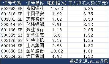 盘中锂电池板块的部分个股走强,获主力资金追捧。亿纬锂能(300014.SZ)、江特电机(002176.SZ)分别以主力资金净流入3.12亿元、1.85亿元跻身个股前十。值得注意的是,今日有色金属板块表现抢眼,洛阳钼业(603993.SH)涨停报收,并凭借5.36亿元的主力净流入额高居两市个股首位。