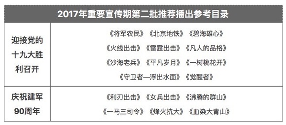在推荐播出参考剧目中,迎接党的十九大胜利召开参考剧目11部,庆祝建军90周年参考剧目6部。以上内容供全国电视台尤其是各省级卫视选购播出。