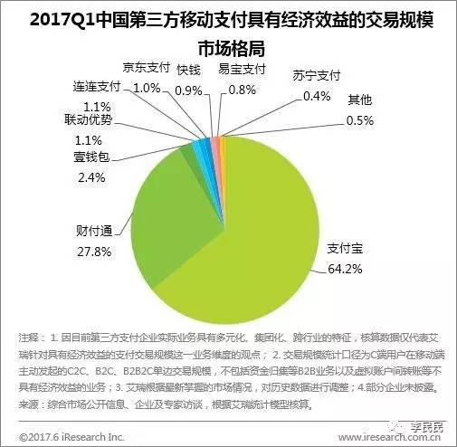 最后,按照艾瑞咨询的观点,在第三方支付业务中,单笔支付交易能否产生营收(是否为具有经济效益的交易额),是对企业进行估值的重要因素之一。在艾瑞咨询发布的2017年第一季度中国第三方移动支付具有经济效益的交易规模市场格局数据中,支付宝市场份额占比达到64.2%,财付通则为27.8%。