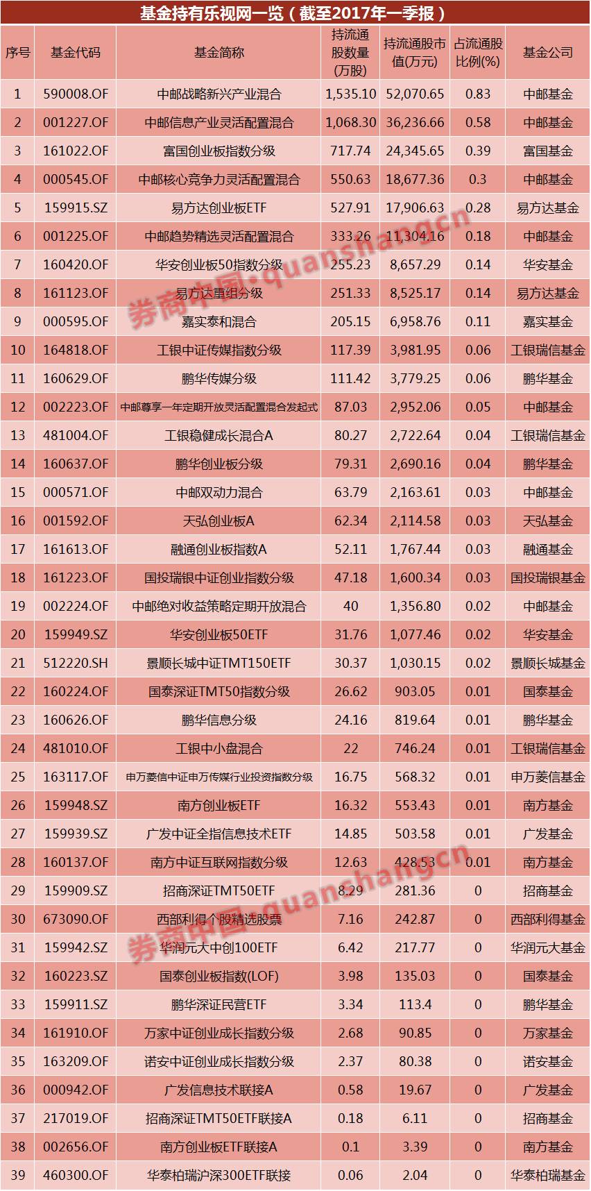 具体来看,中邮基金是乐视网最忠实粉丝,39只基金中,中邮基金占了7只,累计持有3281万股,占比超过五成。