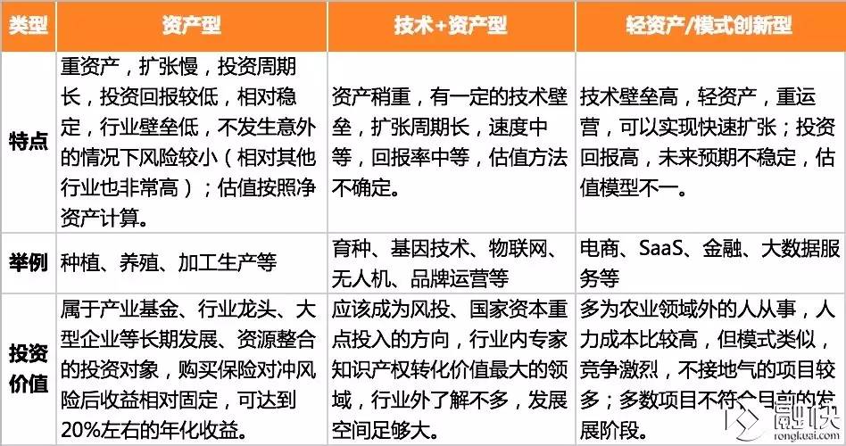 农业项目可以按照资产轻重程度分为重资产型、技术+资产型以及轻资产/模式创新型,各种类型的特点与投资价值可以参考下表。