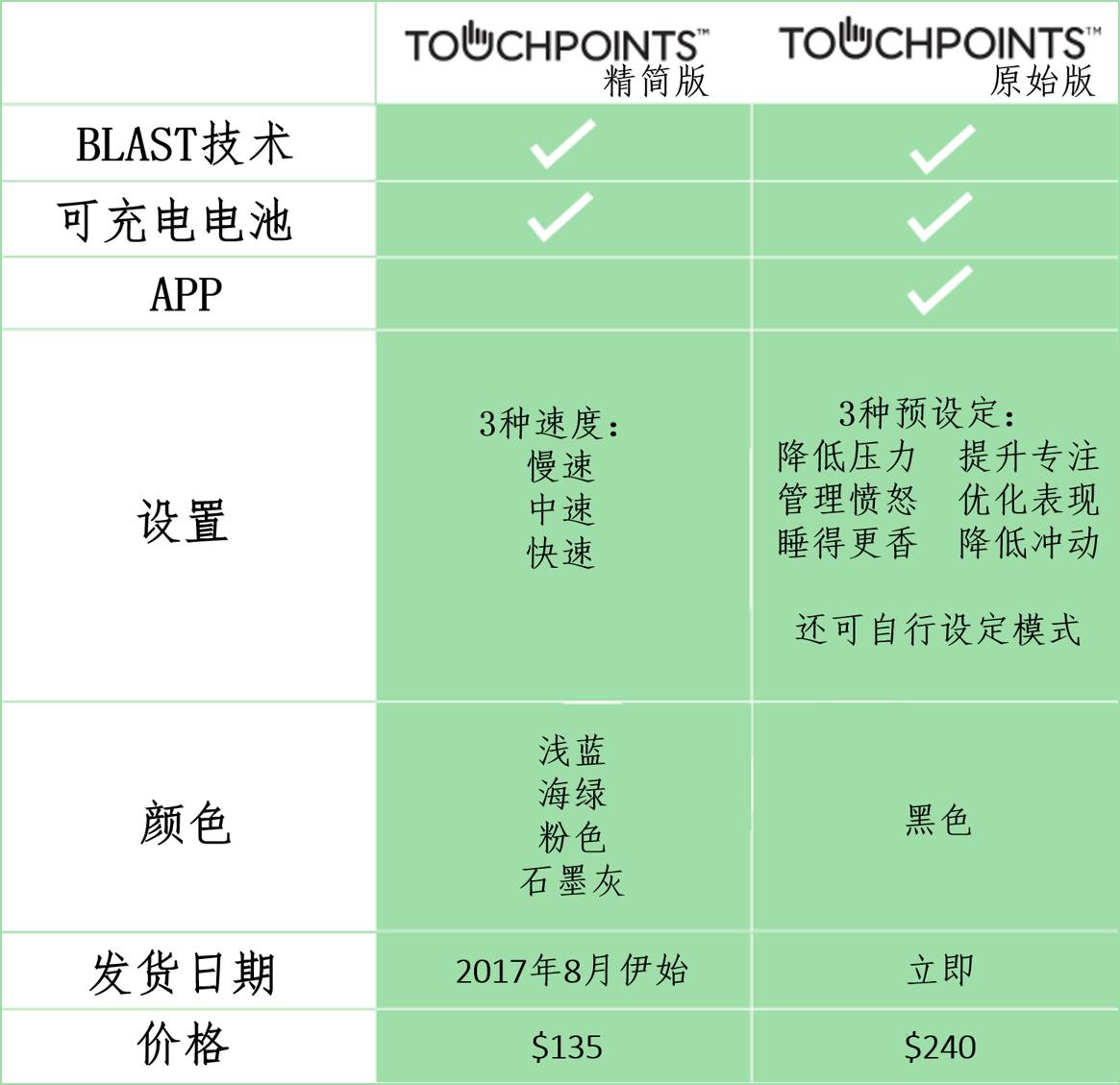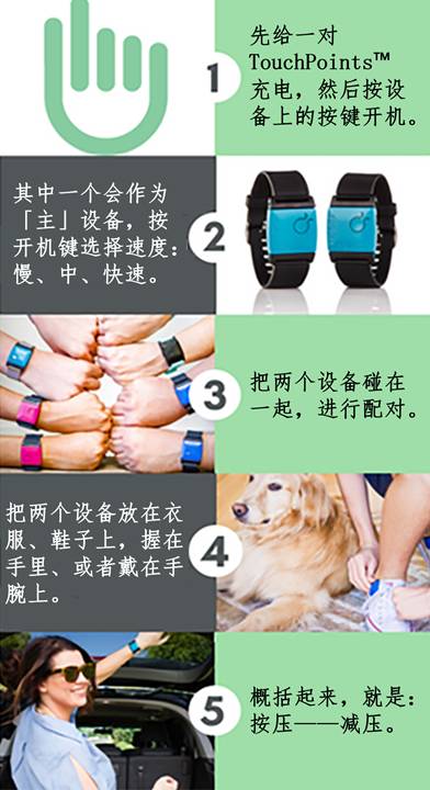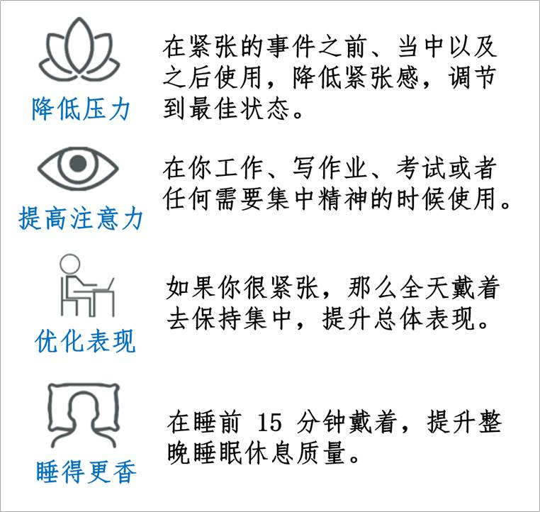 TouchPoints 运用独创的双边调节模拟感知技术(BLAST),会以特定的频率交替振动,在 30 秒内非入侵式地、无创地调节身体压力反应,带来放松,使得佩戴者清晰思考、冷静。