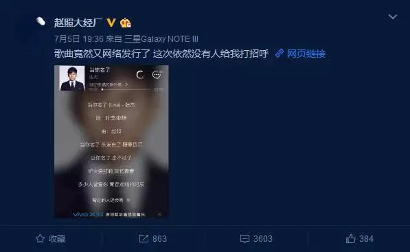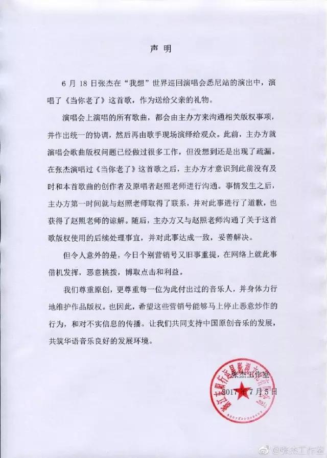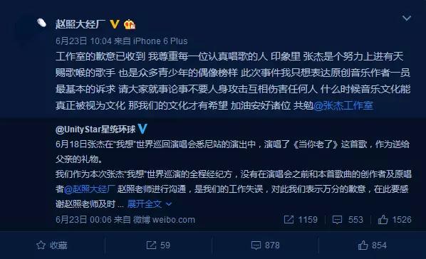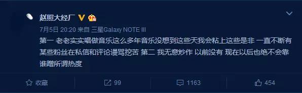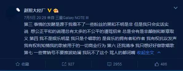 面对这样令人遗憾的局面,赵照转发了这条微博,但是谁都看得出来言语里的失望。而且作为一个尊重版权的音乐人,凭什么就被毫无诚意的申明打发了呢?