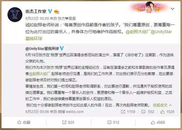 前段时间,张杰未经任何授权,在演唱会上演唱了赵照的《当你老了》还专门发了微博。当粉丝们一片高潮的时候,原作者赵照却是一种说不出的愤怒。