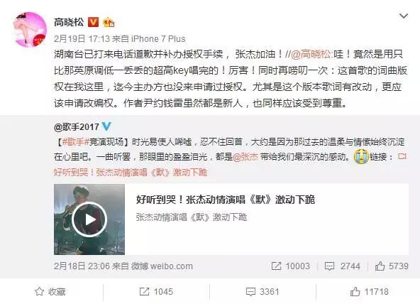 在年初的《歌手》上,张杰翻唱的这首《默》就没有打任何招呼。直到版权所有者高晓松在微博上喊话后,节目组才打电话道歉并补办授权,而张杰本人的微博也没有做出任何回应。