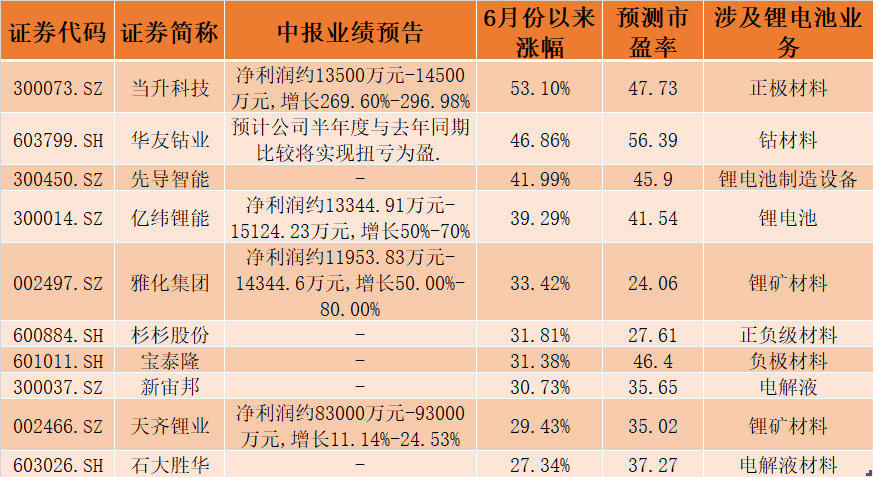 从6月份至今的涨幅来看,涨幅排名前十位的公司业务多涉及锂电池上游的原材料领域,包括正极材料、负极材料、钴材料、锂矿材料等。其中,当升科技(300073.SZ)以53.10%的涨幅排名第一位,华友钴业(603799.SH)以及先导智能(300450.SZ)紧随其后,涨幅分别达到46.86%以及41.99%(下表中“预测市盈率”为根据多家券商一致性预测出的全年净利润及当前收盘价所计算出的市盈率)