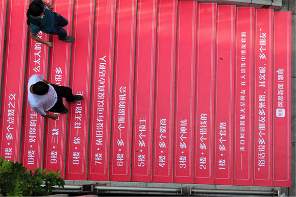 “话说多个朋友多条路,其实呢,多个朋友……”、“灵魂和身体总要有一个在路上”、“穿过次元壁”、“总想改变世界”,这些网友们“一个眼神就懂”的网络爆款流行梗,近日齐齐出现在了广州花城汇户外楼梯和上海静安大悦城摩坊166主题街区的楼梯上,每一个当下年轻人热议的“话题梗”辅以网友的精彩跟贴,通过一阶一阶的楼梯在人流集中地以反套路的方式强势博取着行人的注意力。抖机灵如“多个朋友,多个微商”、“多个朋友,三缺一的概率就小很多”、“灵魂迷了路,身体不知在何处”;深刻如“多个朋友多条路,其实呢,多个朋友,自己却成了他们的路”、“穿过次元壁,你喜欢的人依旧不喜欢你”;当然也有走心如“多个朋友,依旧没有可以说真心话的人”,仅寥寥十余字却表露出了当下只身在大城市工作生活的年轻人的孤独、寂寞和挫败感。因此,不难想象当这样的文字出现在上海、广州等年轻人涌动的中心地带,有的人感同身受,有的则迅速产生相视而笑的默契,因为触达了当下年轻人的内心,“盖楼”行为本身也毫无疑问地成为了今天年轻人热议的“焦点”。