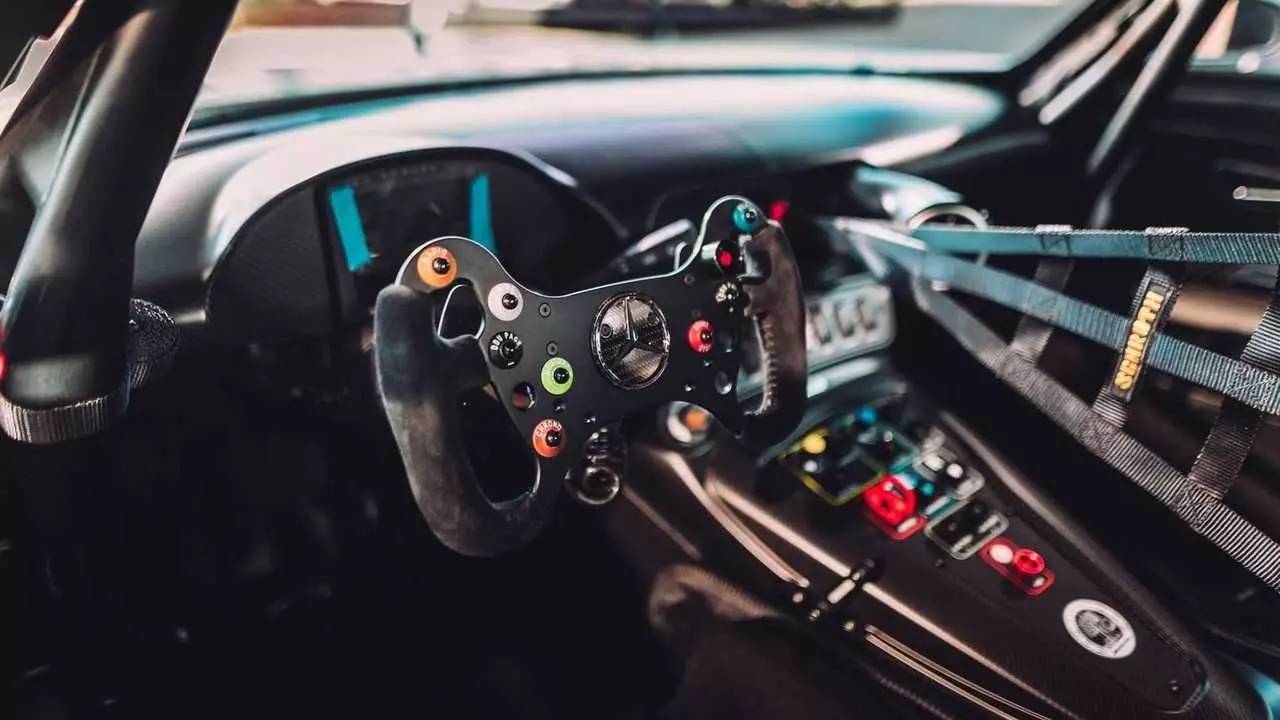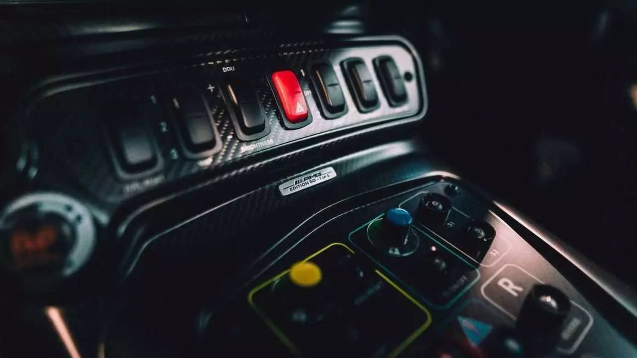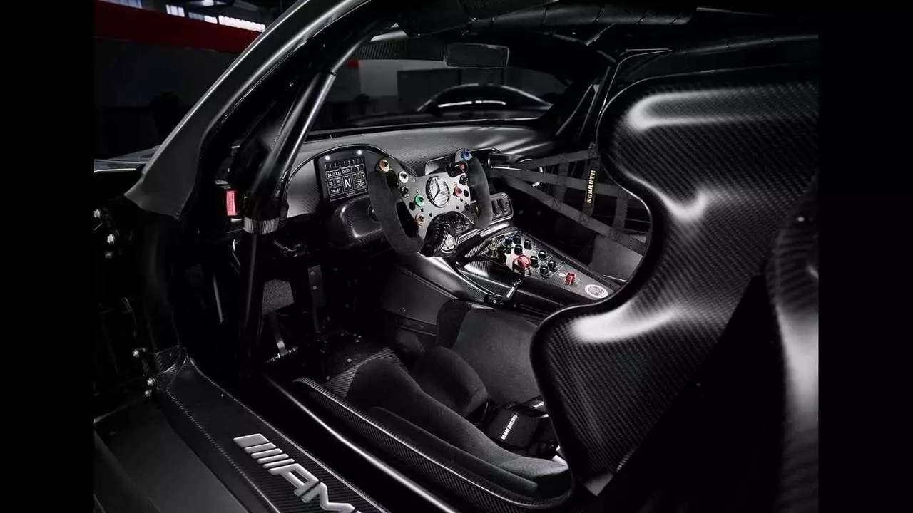 车厢内,配备碳纤维赛车座椅和防滚架,以黑色主题为主。从车门板、地坎到车内仪表盘、中控台,均采用哑光黑碳纤维饰面。车内还有AMG徽章以及车主个人专属编号牌,在安全带上还有和车身上相同的"50 YEARS OF DRIVING PERFORMANCE"字样标识。