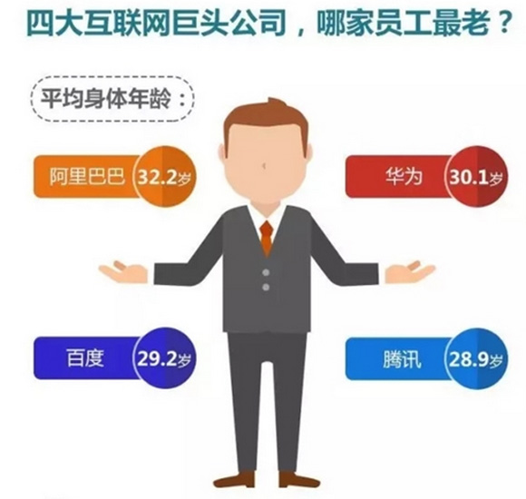 从员工身体年龄来看,阿里巴巴人最老,平均有32.2岁;华为和百度人分别以30.1岁、29.2岁随后;最年轻要属腾讯人,平均仅28.9岁。