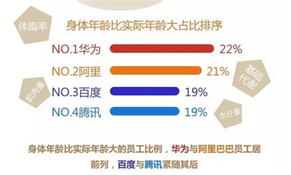 虽然华为人比阿里人平均身体年龄要小约1岁,体脂情况也比阿里人稍好,但以疯狂加班著称的华为员工还是更易显老。报告显示,综合体脂率、肌肉量、基础代谢、水分量等指标考虑,有22%的华为人身体年龄比实际年龄要大。当然,整个互联网圈员工身体状况都比较糟糕,即使健康状况相对较好的百度和腾讯人中,也都有19%偏老。