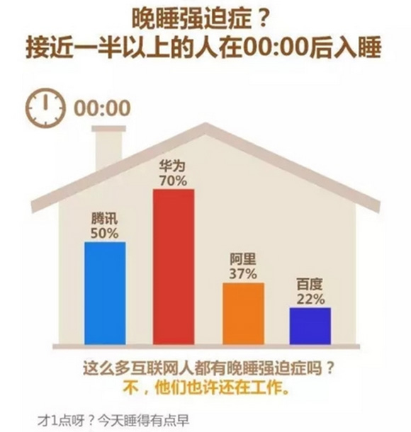 加班也导致很多人的休息时间得不到基本保障。超过一半互联网人都不能在12点前入睡,其中华为人的晚睡情况尤其严重,高达70%的人都得等到第二天凌晨才能睡下。睡眠情况最幸福的要属百度,差不多八成员工还是能做到12点前入睡。
