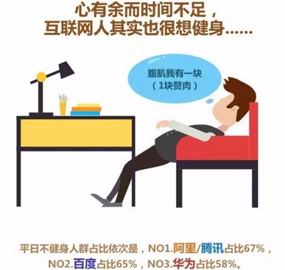 就体脂率而言,最胖的也是阿里人,高达27%的员工体质率超标,近乎相对最精瘦的百度人(15%)的两倍。华为人情况也好不到哪儿去,超过1/5的员工该项都超标。