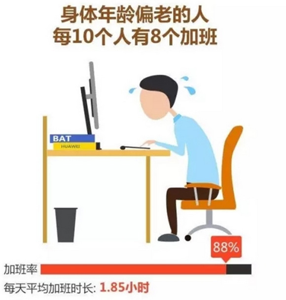加班是催人老的罪魁祸首。在互联网公司,996的工作模式盛行,长期加班成常态。四家巨头中,超过一半的员工每天加班至少两个小时,其中有2%的人每天加班甚至高达8个小时之多。数据也证实了这一点,在那些身体年龄比实际年龄还要老4岁以上的BAT和华为员工中,加班率高达88%,每天平均加班时长1.85小时。