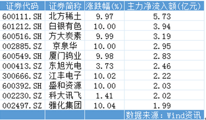 盘中众多有色金属板块个股走强,获主力资金抢筹,表现最为抢眼。主力资金净流入额前十中,占据6个席位。其中,北方稀土(600111.SH)、白银有色(601212.SH)、方大炭素(600516.SH)更是以主力资金净流入5.73亿元、3.94亿元、3.19亿元跻身个股前三。盛和资源(600392.SH)也以涨停报收。厦门钨业(600549.SH)和次新股江丰电子(300666.SZ)吸引主力资金净流入2.83亿元和2.22亿元,强势进入前十。