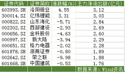相比之下,同属于有色金属板块的洛阳钼业(603993.SH)昨日还高居主力净流入额个股首位,今日却遭遇主力资金大力抛售,以3.12亿元的主力净流出额位居个股第一。亿纬锂能(300014.SZ)今日依旧遇冷,其主力净流出达3.03亿元位列第二。