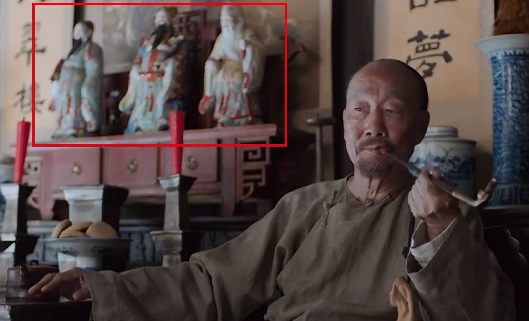 鹿家老爹的屋内陈设也是相当讲究,明间中部靠墙处,一翘头案、一方桌、两扶手椅,标准的中堂家具陈设方式。案上中部架设的三屉小供案,上陈与屋外匾额相呼应的“福禄寿三星”瓷塑像。
