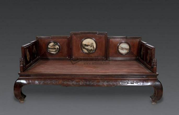 清代嵌云石七屏风鼓腿彭牙罗汉床