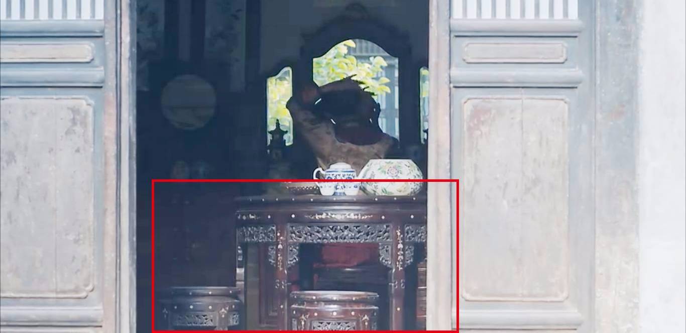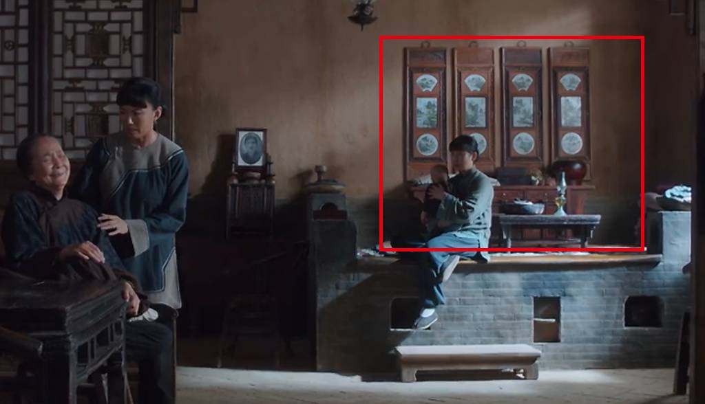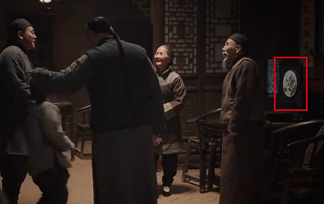 祖上就是村中族长的白家,在家具陈设上虽比不上鹿家,但是也要比一般的农村家庭强上很多。白家老爹屋中明间,同样采用一案、一桌、两椅的搭配。和鹿家供“福禄寿”不同的是,白家老爹在桌上放置一嵌瓷板的小座屏,取“平安平静”之意。保宗族平安,也是族长分内之责。