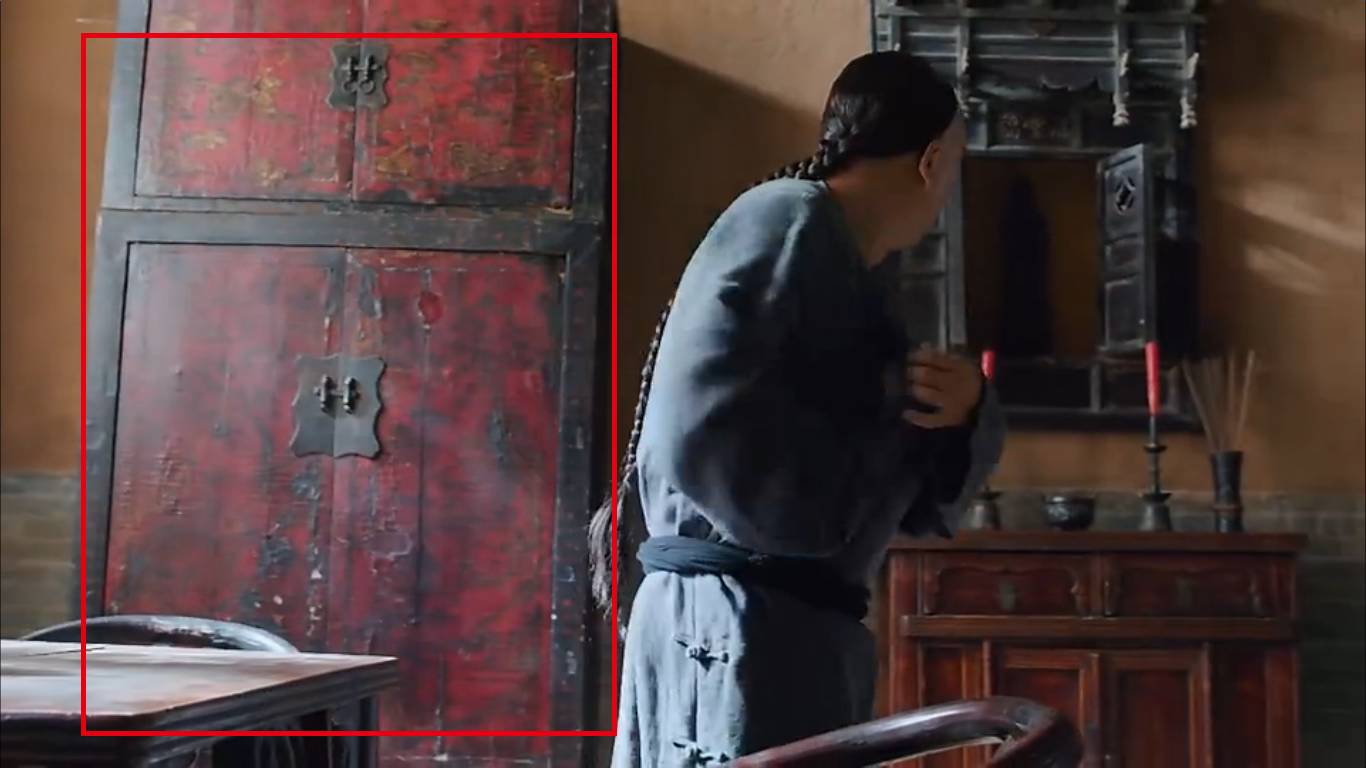 白家老爹屋中左间,摆放有一对髹黑朱漆(疑似描金)的顶箱柜,比不上鹿家黑漆描金柜的讲究,但在当时也不是一般村民能用得起的。这也就能理解,为什么白嘉轩能先后娶七个老婆了,真是“土豪”。