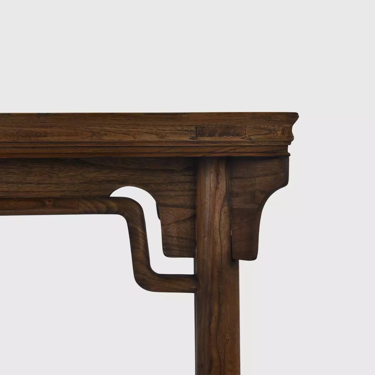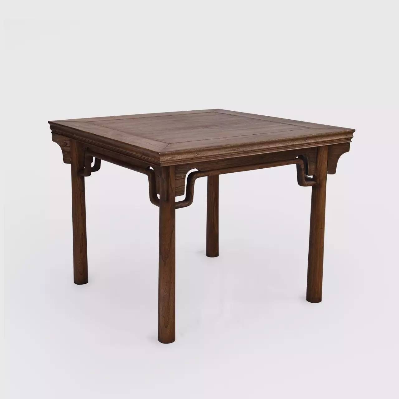 此方桌精选榆木老料,全手工制作。四拼面心,边抹结合采用格肩榫结构,并以凹陷的素混面和多道阳线进行线脚装饰;桌面下方,四腿间通过素牙板,以及顶牙罗锅枨结构连接;牙板与腿足的结合方式,应用了明式家具中经典的“每个腿足三个牙子”——一腿三牙结构,实用美观。腿足圆浑,用料粗壮,有大巧不工之妙。经典的明式风格方桌,是您打造中式书房,以及家人阅读交流空间的最佳之选。