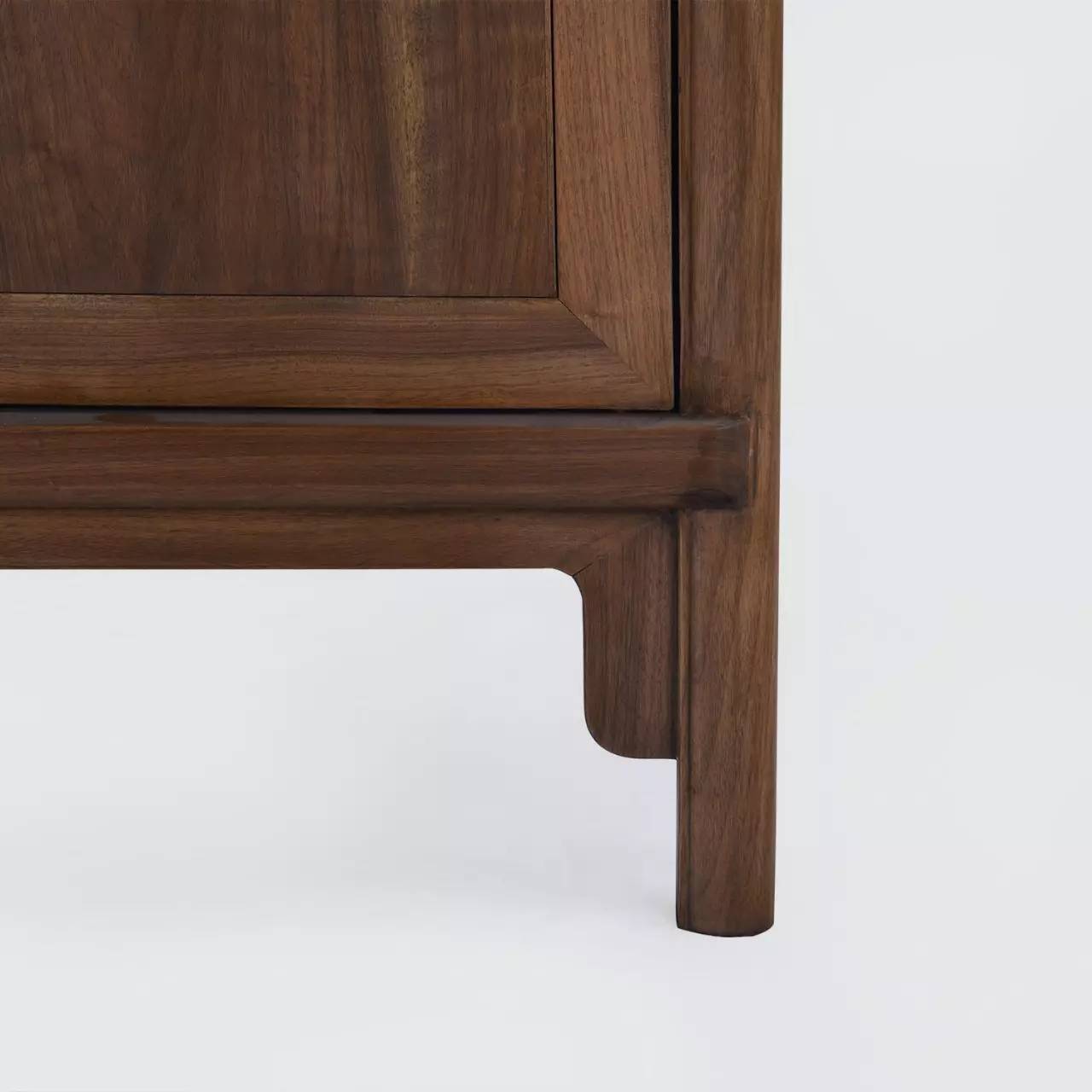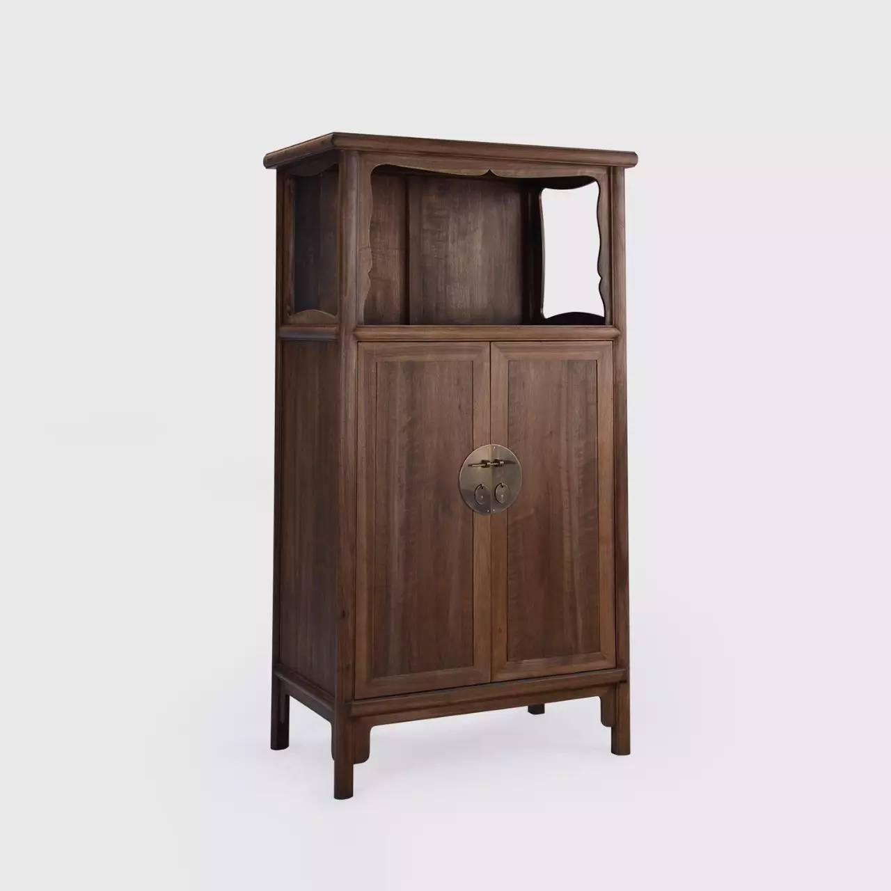 此万历柜精选核桃木老料,纯手工打制。整体框架式结构,上部为三面开光的亮格,其中正面牙板采用源于佛教建筑的壸门样式,两侧牙板采用曲线优美的“洼堂肚”造型;下部为双开门的柜体,柜门面板采用“一木对剖”工艺,使两块柜门的木纹一致,协调统一;柜体腿足带有“侧脚”设计,增强了结构的稳定性。 虽然此柜整体光素,无任何雕刻纹饰,但每一个构件上均运用了“混面”、“起线”、“透榫”等明式家具最为经典的装饰手法和榫卯结构,让此柜无论从工艺、审美以及实用角度来看,都具有极高的收藏价值。