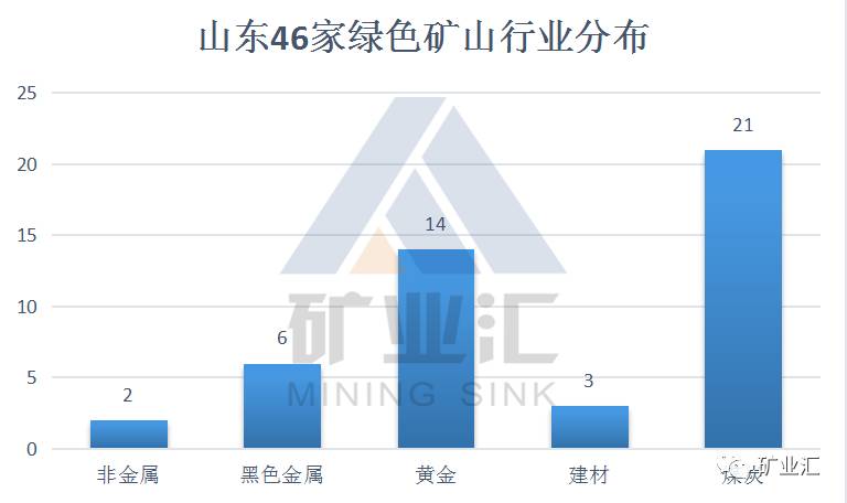山东46家国家级绿色矿山中,煤炭有21家,占46%,其次为黄金行业(14家)和黑色金属行业(6家)。