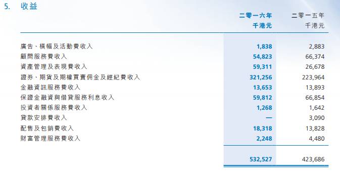 2016年华富国际收入为5.32亿港元,比上年增1亿港元,增加的收入主要是来自佣金及经纪收入。经纪佣金收入为3.2亿港元,占收入比为60%;此外收入占比较高的有顾问服务收入,金额为5500万;资产管理收入为5900万;孖展融资利息收入为6000万。