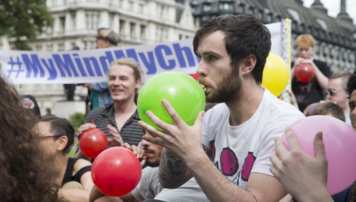 据英国《独立报》报道,2015年8月1日,英国政府计划将一氧化二氮纳入“精神活性物质”法案的非法销售名录,当时有数十名示威者坐在英国议会大厦外高举气球,集体吸入笑气,以示对法案的抗议。
