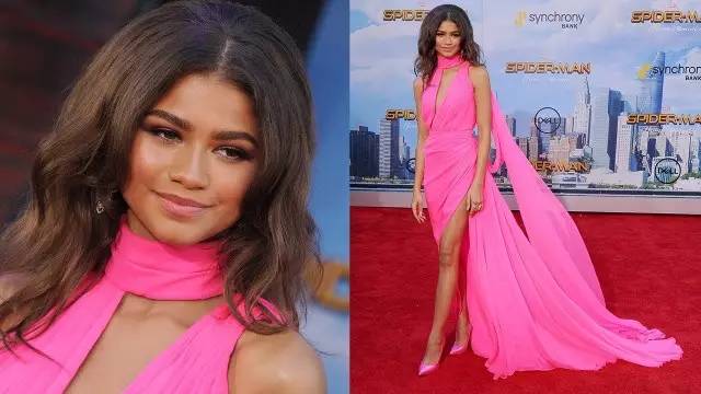 粉色拖地长裙配粉色高跟鞋,大胆的搭配,但是衬托出Zendaya独特气质,美丽无比。