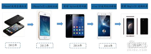 东吴证券指出:背靠最大消费市场和大批高质量供应链资源,中国手机厂商正由创新的跟随者转变为创新的引领者。2012年苹果在iPhone5上首次采用金属机身,大约领先行业大规模使用这一方案一年以上。2013年iPhone5S首次采用指纹识别方案,同样引领了这一趋势。但进入新一轮创新周期后,双摄像头、OLED屏幕、3D非金属机身等行业的新一批技术创新点的引领者变成了中国厂商。2014年,华为在荣耀 6plus率先应用双摄;同年,vivoX5采用了AMOLED屏幕。