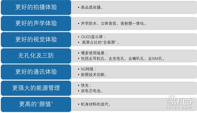 需求决定供给,智能手机厂商需要朝七大升级方向努力: 更高的颜值(非金属化)、更好的通讯体验(射频器件变革)、更好的视觉体验(OLED 显示、全面屏等)、更好的拍摄体验(双摄)、更强大的能源管理(无线充电、快充、双电芯)、更多样化的应用场景(无孔化、三防)、更好的声学体验(立体声、音射频一体化)。
