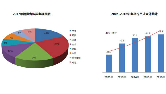 中国电子商会在对消费者进行的随机采访和网络端调研结果显示,在影响电视购买决定的因素中,画质、品牌、尺寸分列前三位,占比分别为24%、18%、17%,这说明价格不再是消费者考虑购买彩电的首要因素了,他们更热衷的是品质消费。