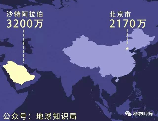 和庞大的国土面积比起来,沙特的人口很少。其全国有3200万人口,排名世界40位,也是阿拉伯世界的第6名,规模仅仅相当于加上流动人口的北京。