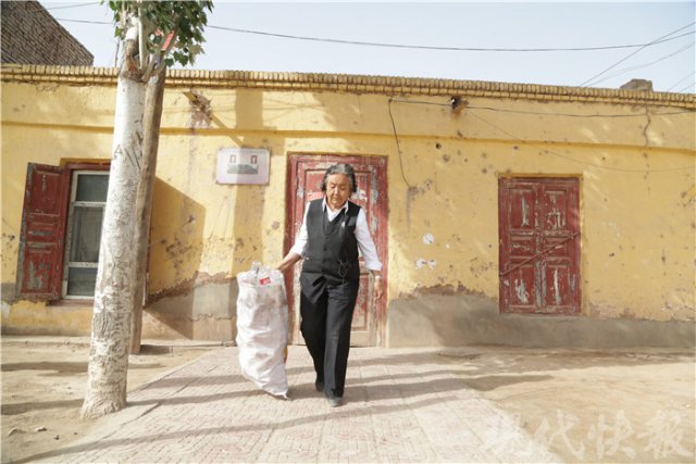 她家门旁的土墙上,挂着一个不锈钢框的牌匾,上面写着 " 疏勒镇新市区社区爱心小课堂 ",固定牌匾的钉子已经锈迹斑斑。