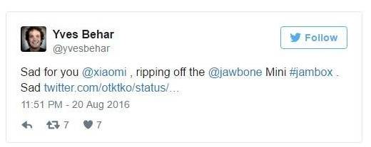Jawbone首席运营官伊夫斯就曾在Twitter 上,直接炮轰小米,说“你抄袭我的设计!”。