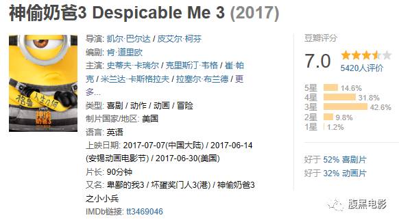 我也是经过了漫长的等待才等到今天的啊,结果你给我剧透。今天下午,阿布只能带着桃子透露的剧情走进电影院。说实话,对于第三部质量稍稍有所下降阿布是有心理准备的,但是我没想到在网上会被很多人打一星,这······有些过分了吧。目前为止,《神偷奶爸3》豆瓣评分7.0分。